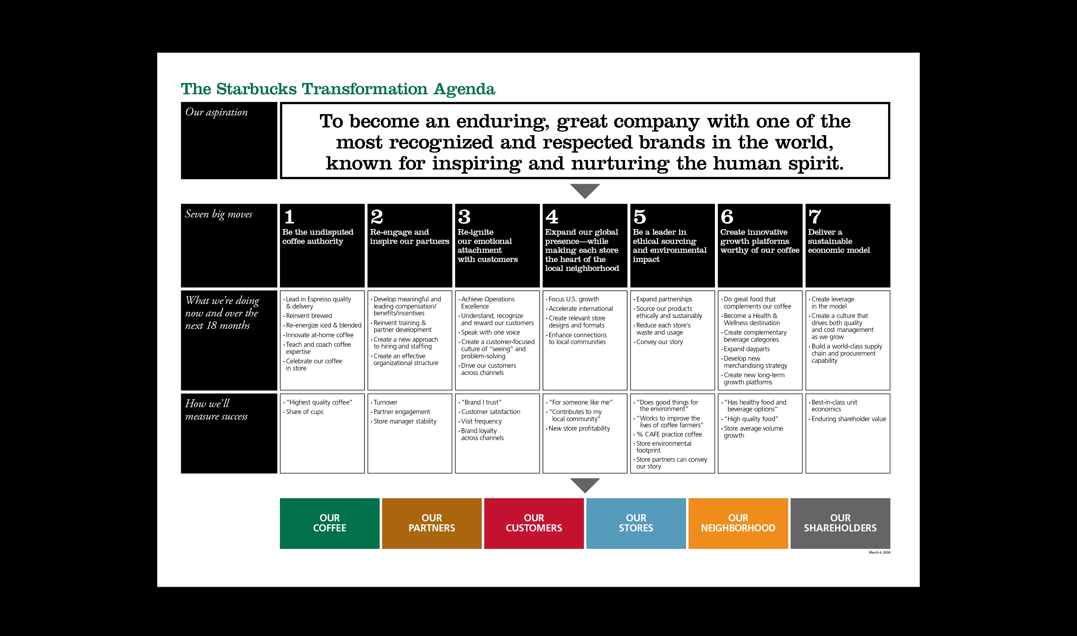 When Starbucks lost its way in 2008, SYPartners aligned the leadership team behind a new vision of what they wanted to become. The process required leaders to imagine and debate possible future retail and product experiences they might own in the market. The ultimate vision anchored a three-year strategic transformation plan, and sparked product and retail innovations that turned the business around.